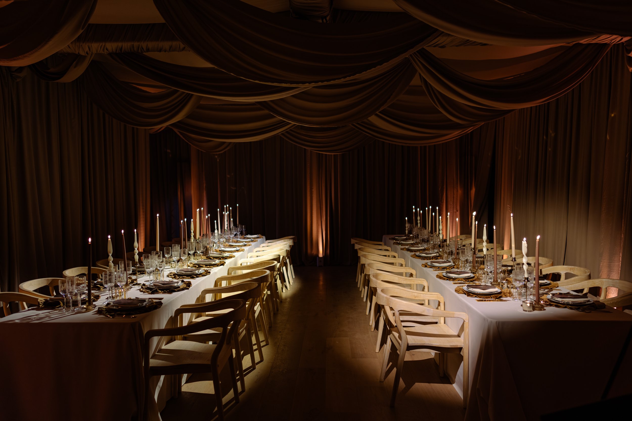 After the ceremony, guests entered into the transformed Ballroom for the first time. A dining area covered in opulent drapery, seamlessly blending the couple’s love of contemporary styling with classic elegance.