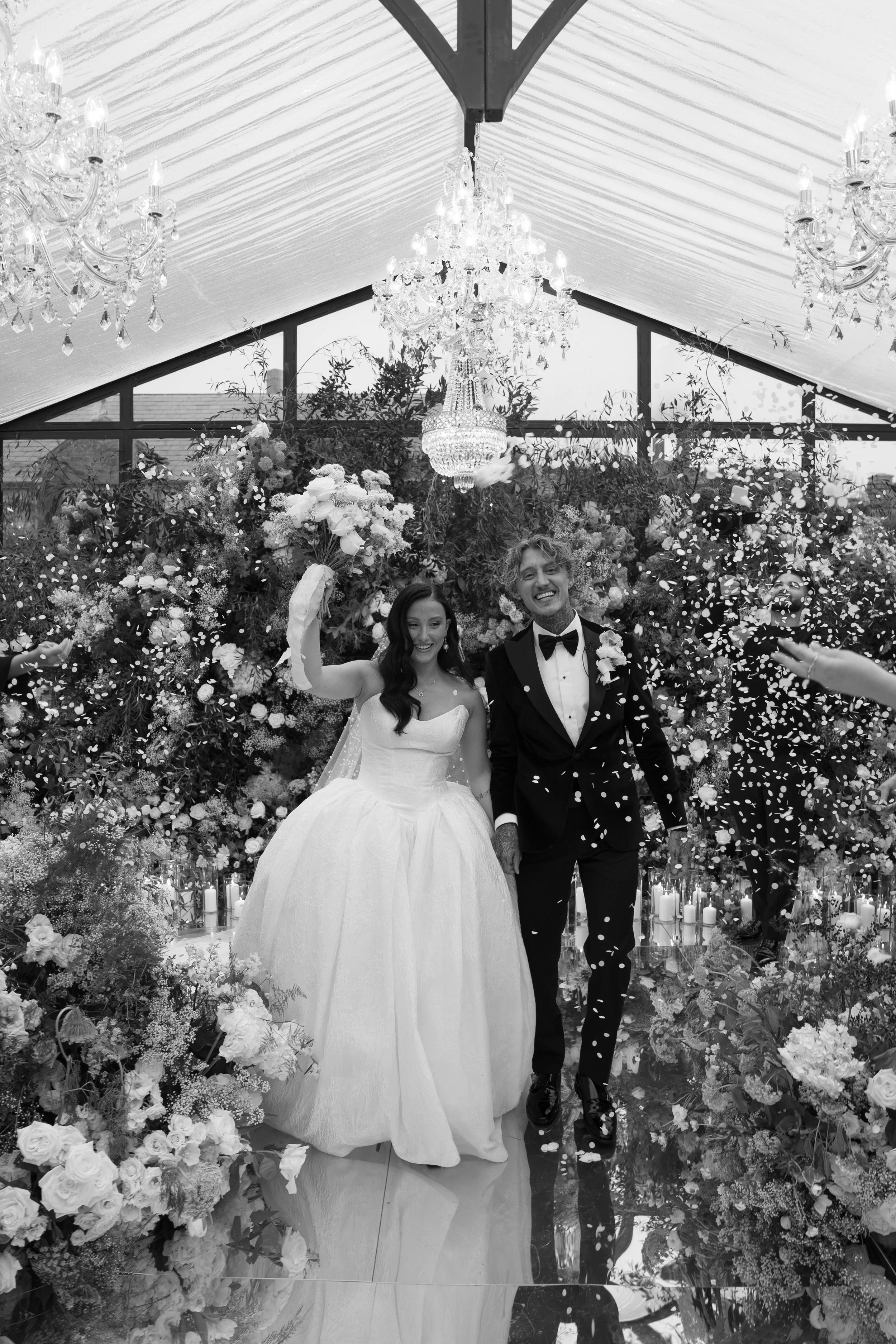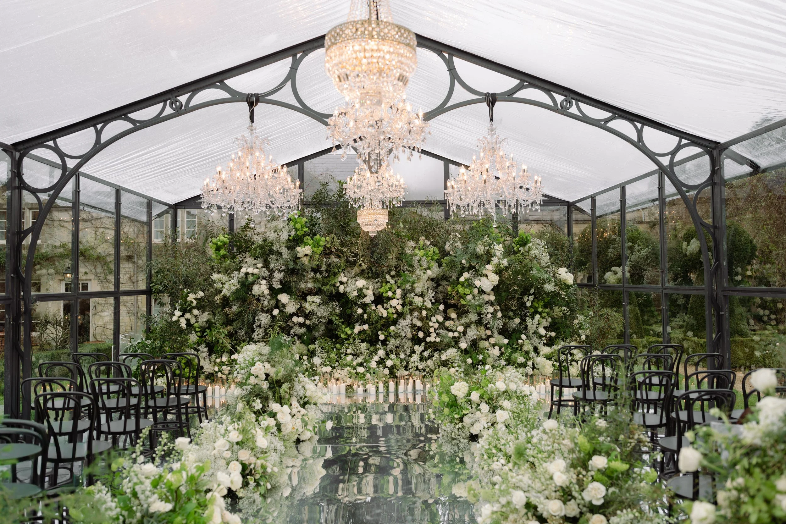 The ceremony design was a fairytale personified. A 10 x 7 metre rambling floral installation covered in white blooms spanned the entire back wall of the structure, while crystal chandeliers appeared to float beneath the glass ceiling and hundreds of hurricane candles glowed in the fading light.