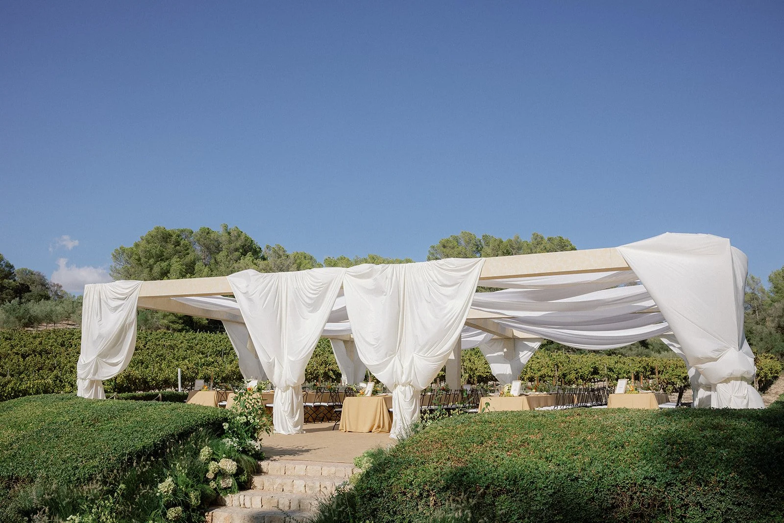 After being transported to the Finca Serena Vineyards, guests found their seats via personalised cream leather luggage tags before making their way to a raised platform where a draped wooden pergola, adorned with long tables, awaited them.